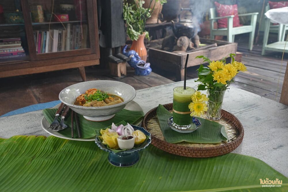 ที่นี่ไม่ได้มีแค่เครื่องดื่มเท่านั้นค่ะ ยังมีเมนูอาหารง่ายๆ ทำสดใหม่ สไตล์บ้านๆ ให้เลือกทาน จานไม่ใหญ่ แต่เต็มไปด้วยความตั้งใจ ตกแต่งจานมาอย่างสวยงาม น่าทาน สั่งข้าวซอยไก่มาทานรสชาติโอเคค่ะ