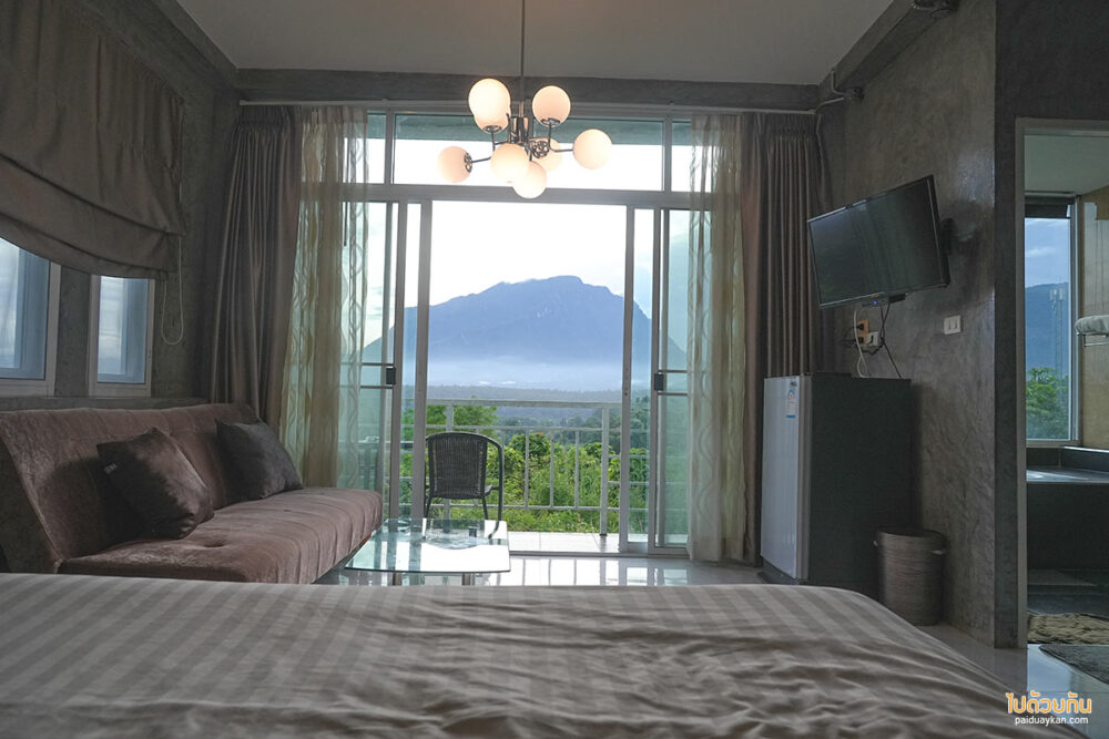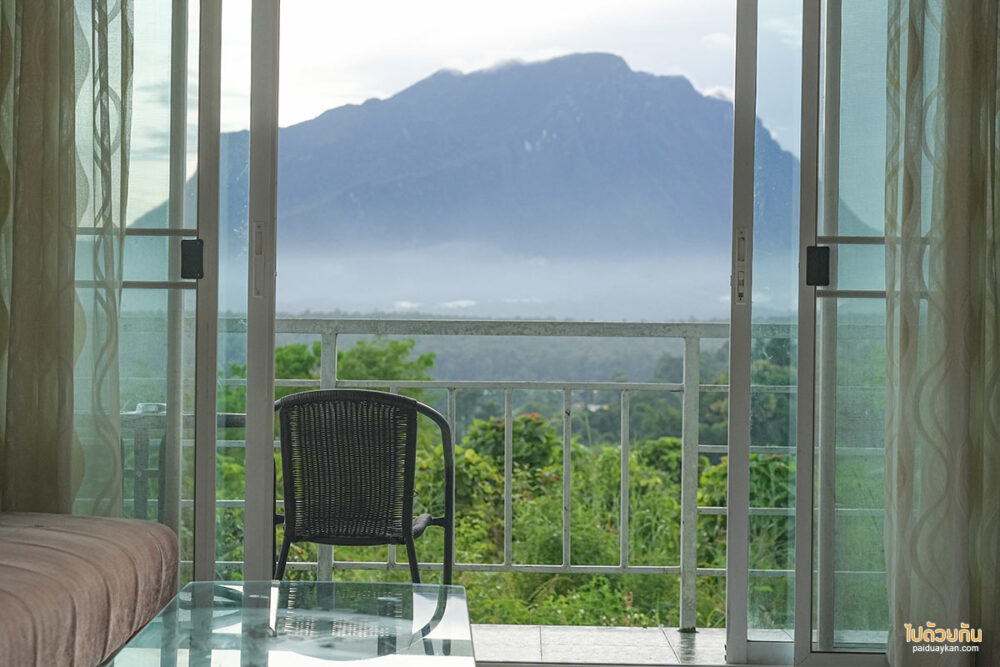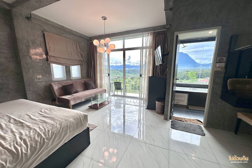 ส่วนใครชอบนั่งชิลล์กลางแจ้ง ด้านนอกก็มีระเบียงให้นั่งเล่นชมวิวแบบเต็มตาอีกด้วย นอนบนเตียงมองออกไปนอกประตู มองเห็นวิวดอยหลวงแบบไม่มีอะไรบัง และมีที่นั่งเล่นข้างนอกด้วย อะไรมันจะดีขนาดนี้