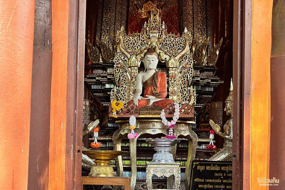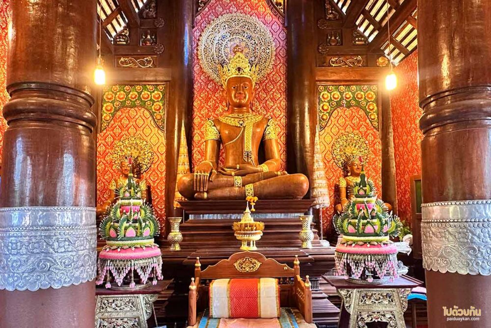 ภายในวิหาร ประดิษฐาน พระประธานไม้แกะสลักองค์ใหญ่ ทำจากไม้สักทั้งองค์ มีพุทธลักษณะงดงาม อ่อนโยน และเปี่ยมด้วยพลังศรัทธา หลายคนที่มาเยือนมักใช้เวลานั่งสงบจิตอยู่ตรงนี้ เงียบ ๆ ฟังเสียงลม เสียงธรรมชาติ และปล่อยใจให้ผ่อนคลาย